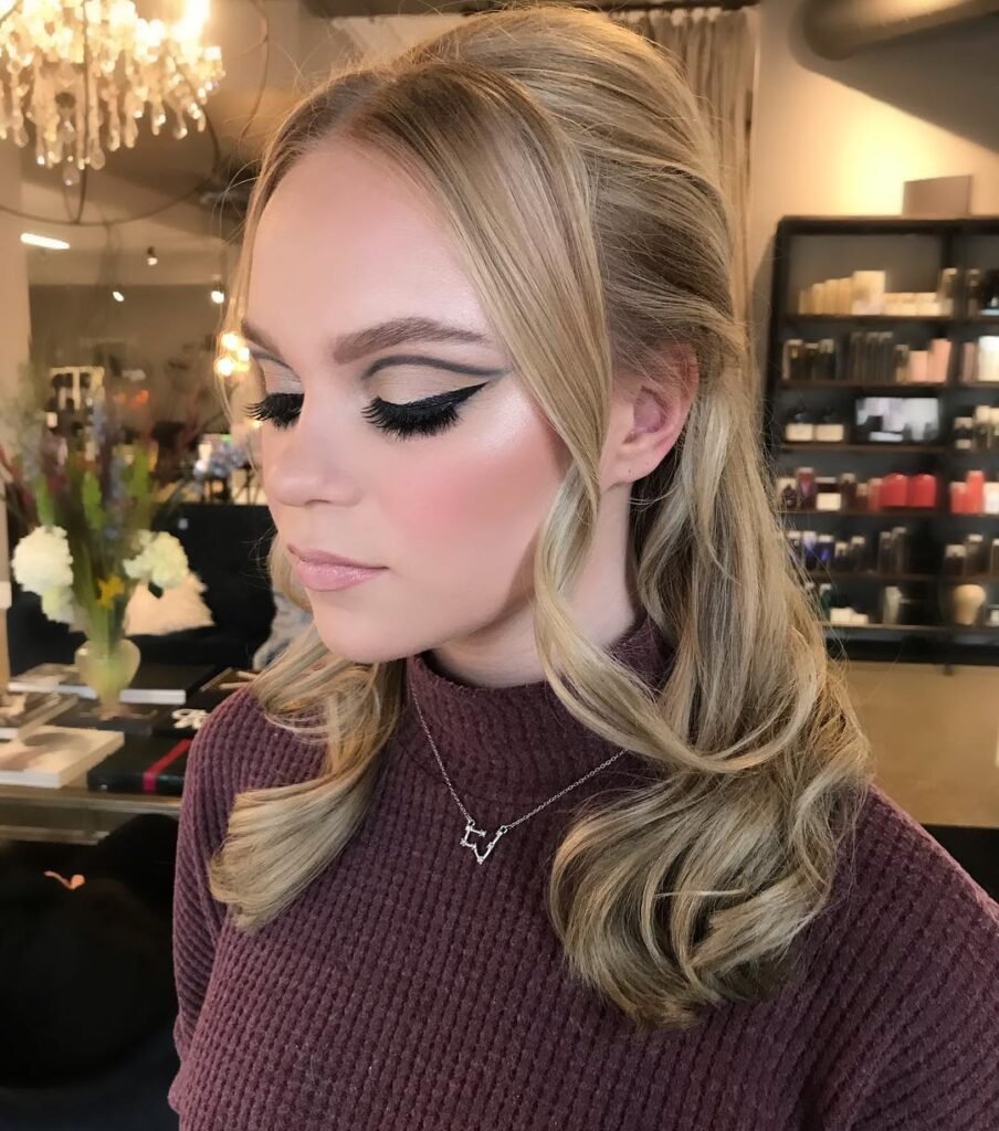 4. Soft Half-Up Hair and Winged Eye Makeup