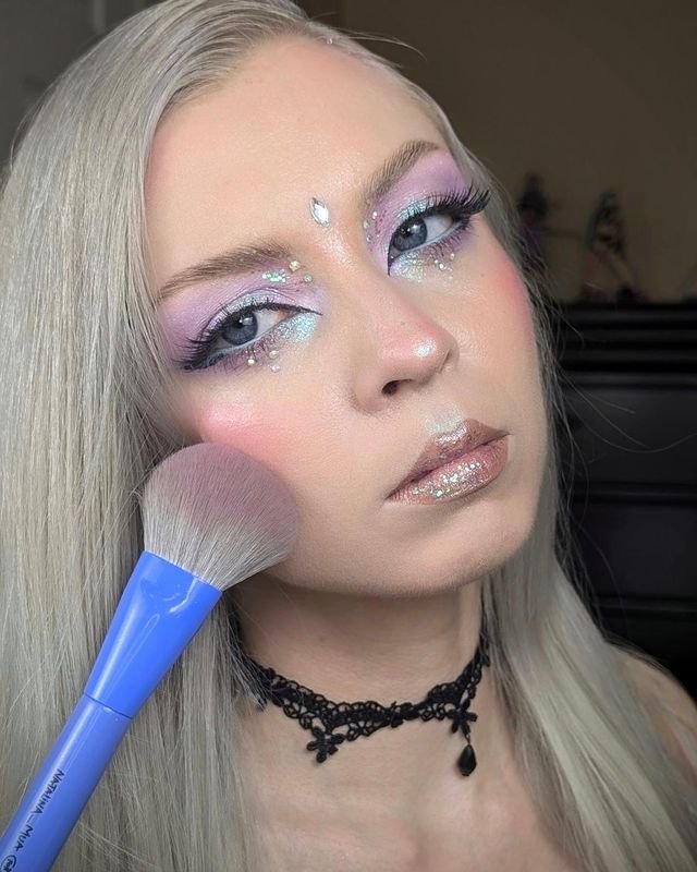 Create a glamorous look with smoky lavender eyeshadow and glitter highlights. Start by applying a lavender base, then add a darker purple to the outer corners for depth. Lightly dab glitter on the inner corners for added shimmer.