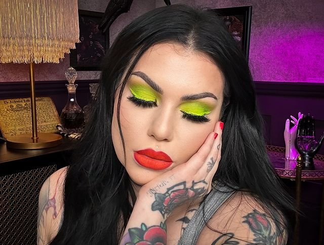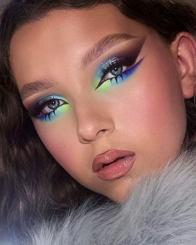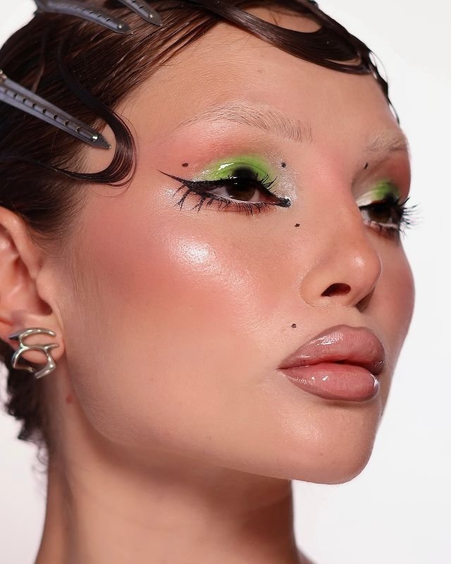 Go bold with a neon green cut crease paired with glossy, dewy skin. Apply a bright green shadow on the crease and keep the rest of the lid neutral for contrast. Add a winged liner and finish with a clear, high-shine gloss on the lips.