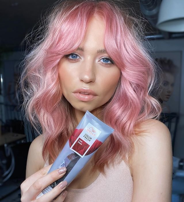 For a soft ’70s-inspired glam, try pink frosted waves and glossy lips. This look pairs pastel pink hair with nude makeup to achieve a fresh, ethereal vibe. Begin with a light pink blush on the cheeks and a glossy, sheer pink lip gloss.