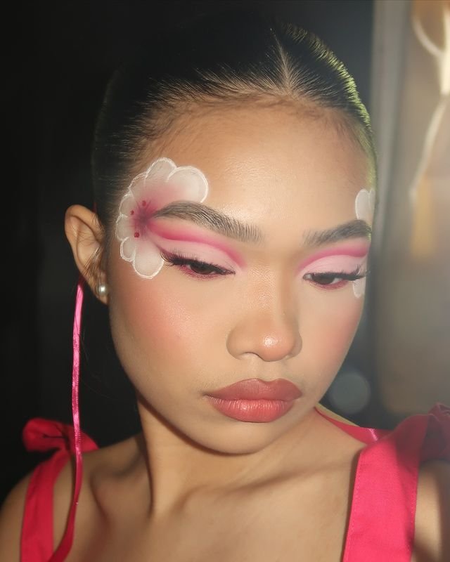 To achieve this, outline the flower shape gently and fill it in with a white pencil. This look is reminiscent of the flower-power influence of the ’70s and adds a whimsical, artistic touch to glam makeup. Pair with neutral nails to let the floral details shine.