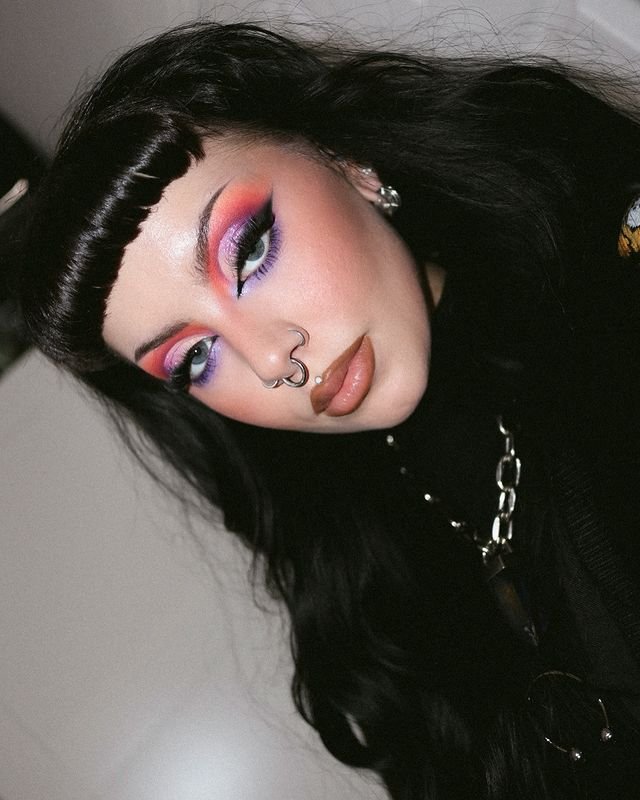 This sunset gradient eyeshadow look combines pink, purple, and orange tones for a ‘70s-inspired vibe. Blend pink on the inner corners, purple on the lid, and orange at the outer edges, then finish with a winged liner.