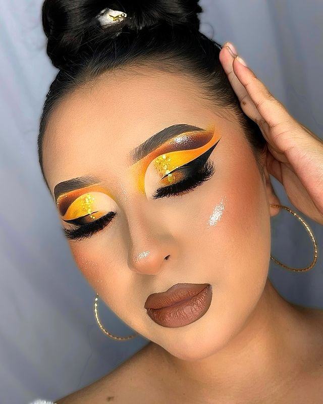 To achieve this, use a fine-tipped brush for precise gold detailing. This look is all about creating a high-contrast eye that radiates sophistication and drama. Pair with gold-toned accessories to amplify the glamorous vibe.
