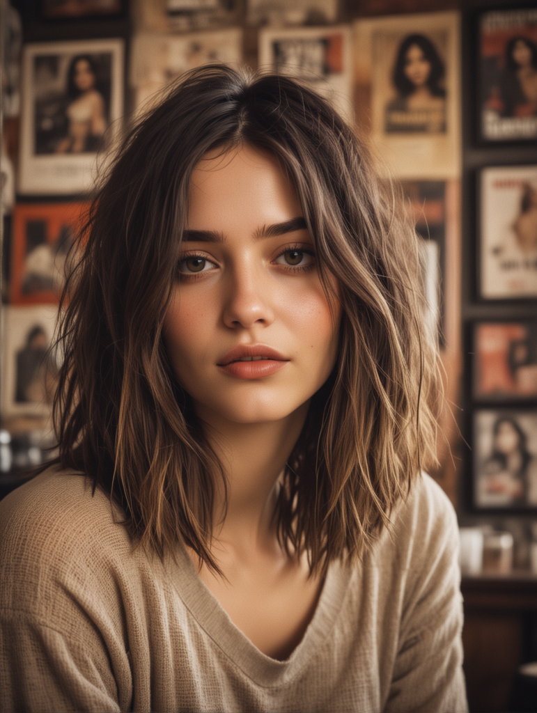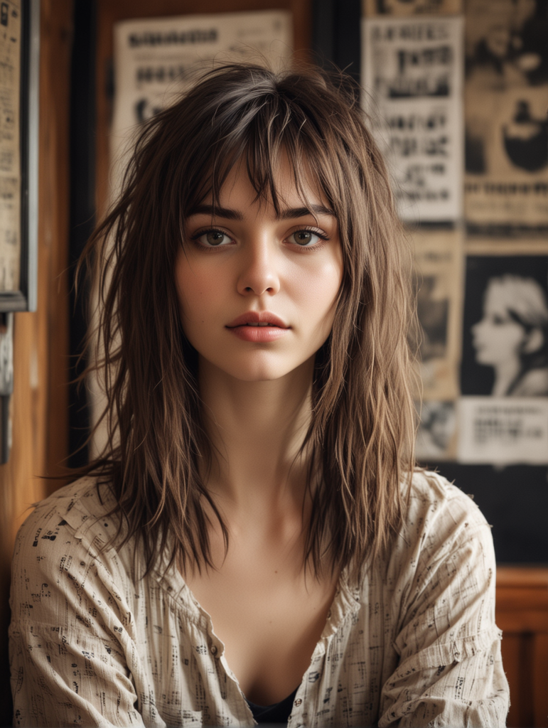 Wispy Bangs paired with shoulder-length, choppy hair are perfect for a casual, unkempt look. This style is all about looking effortlessly cool.