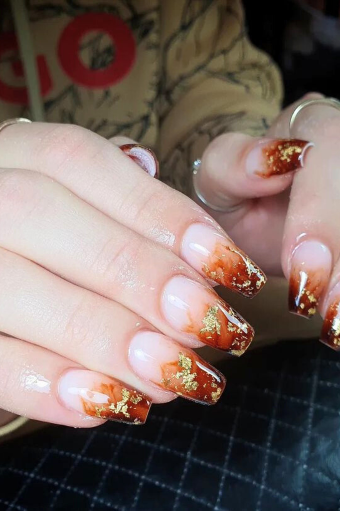 Now for the fun part—adding amber effects! You can use a sponge to dab on a mix of orange and gold polish, creating a marbled look.