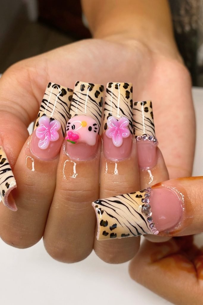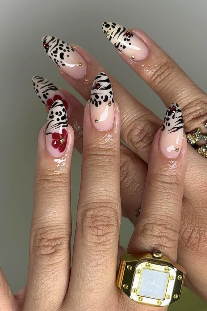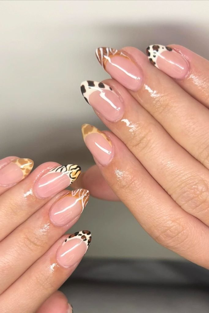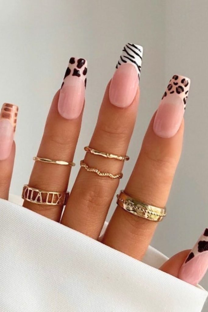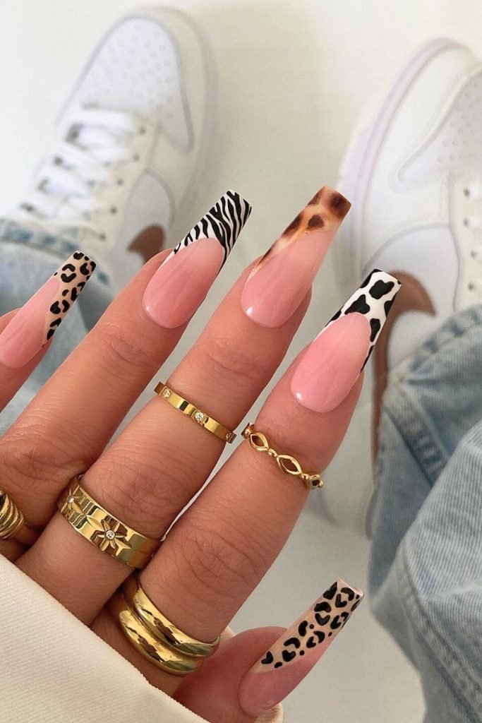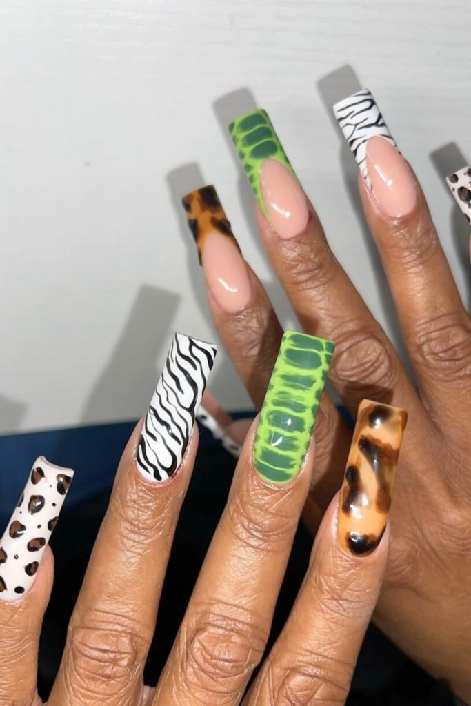These nails showcase an assortment of animal prints – zebra, leopard, and cheetah – on the tips, creating a fierce and stylish look.