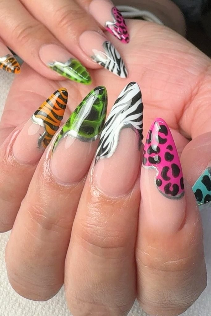 Each nail showcases a different pattern, from tiger stripes to leopard spots and zebra prints, all set against bright hues like green, pink, and orange.