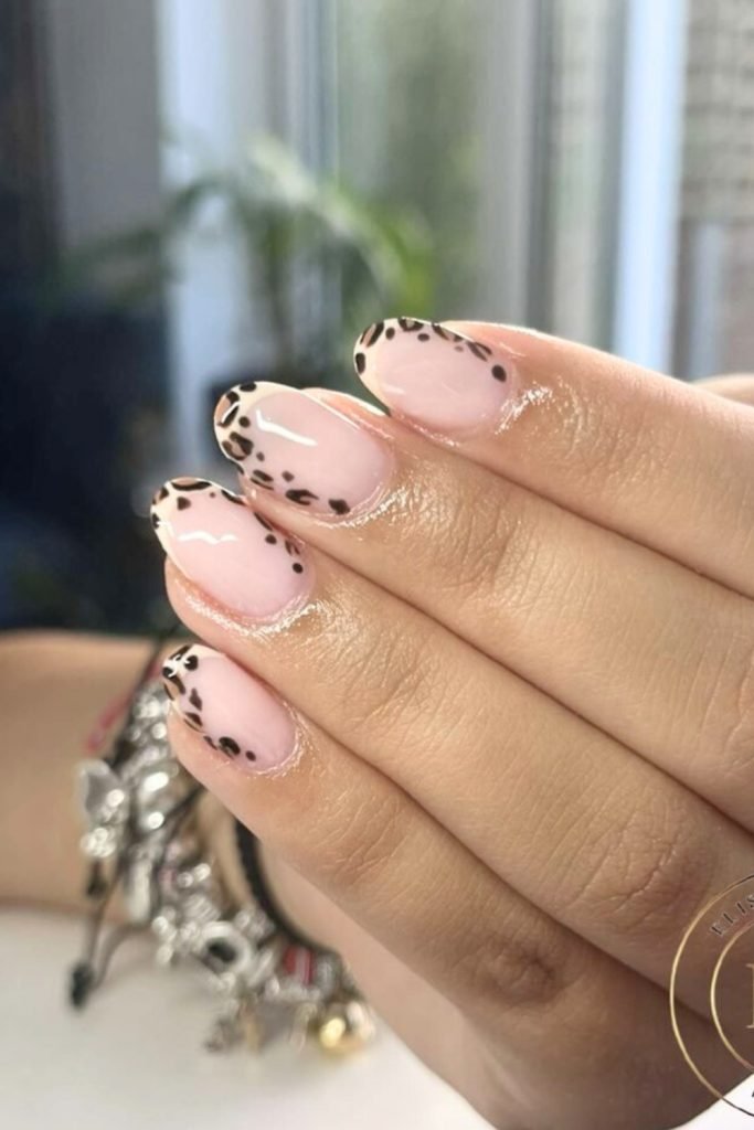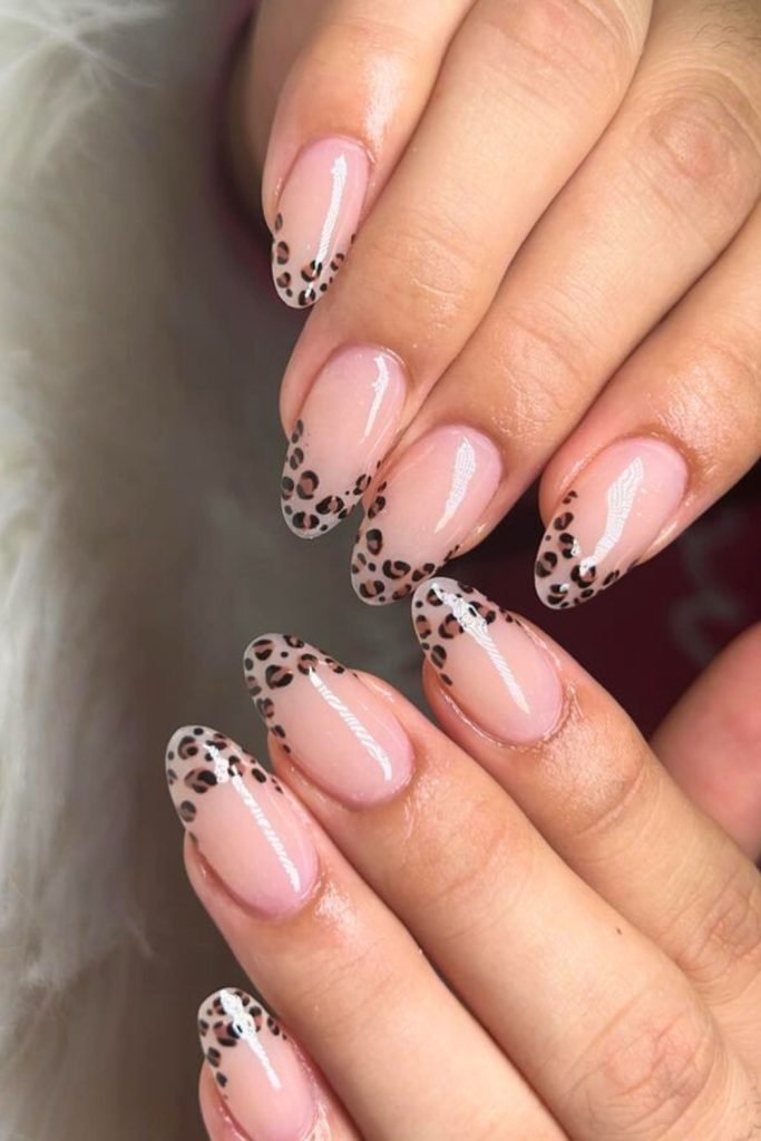 These Minimalist Leopard Tips nails feature a delicate design with a clear nude base and subtle black leopard spots concentrated on the tips.