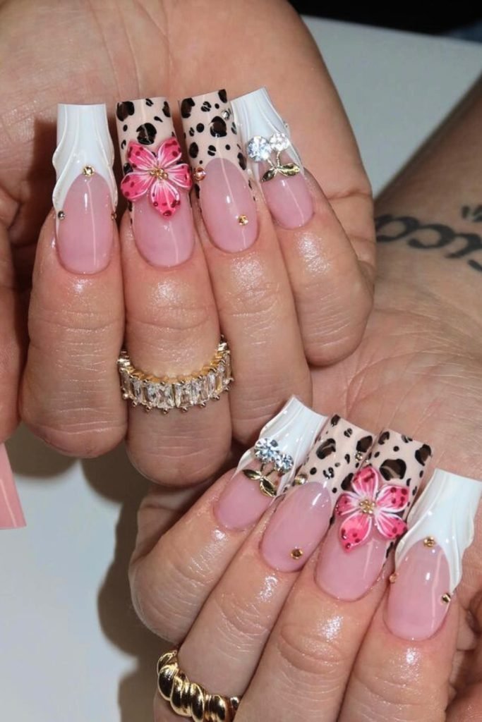 These Glamorous Leopard Accents nails feature a stunning mix of pink and beige bases adorned with black leopard spots and intricate 3D floral decorations.