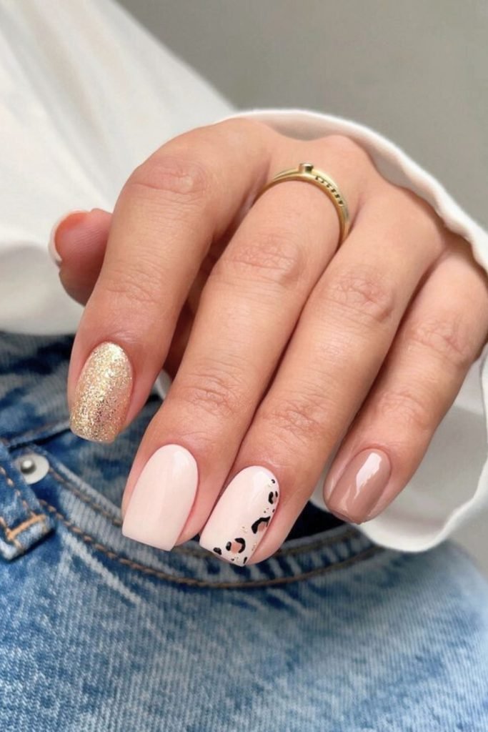 The design includes a mix of solid beige, glossy nude, and glittery gold nails, accented by delicate black leopard spots on a white base.