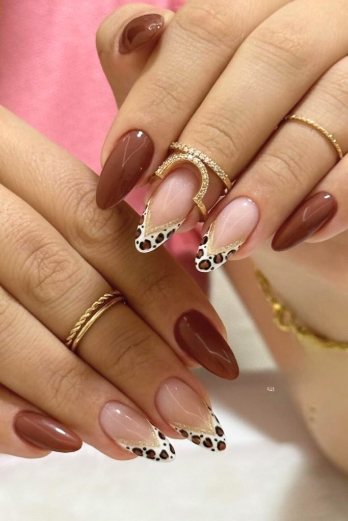 The design features deep brown nails paired with nude French tips accented by intricate leopard prints and a touch of gold trim.