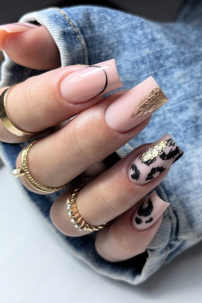 The design features a nude base with minimalist black lines, striking gold foil accents, and dramatic black leopard spots.