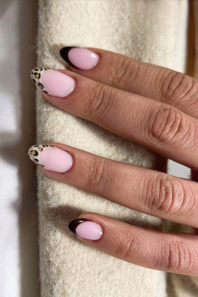 The design features a soft, pink base with two distinct accent nails: one adorned with a chic leopard print and the other with a sleek, black French tip.