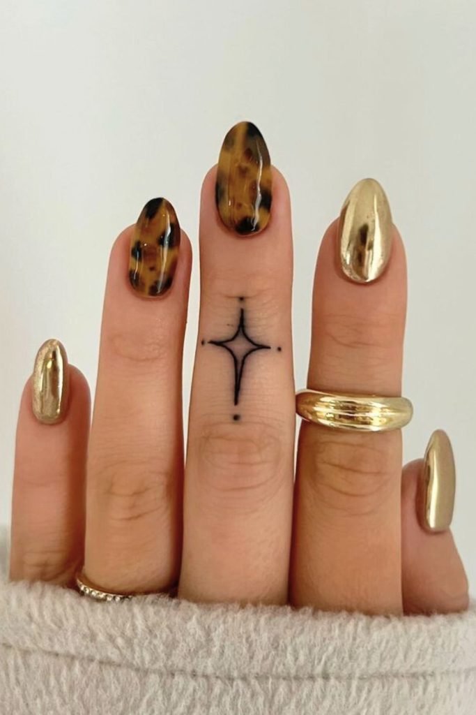 These Luxe Tortoiseshell nails blend elegance and wild charm. The design features a mix of high-shine tortoiseshell patterns on almond-shaped nails paired with gleaming gold accents.
