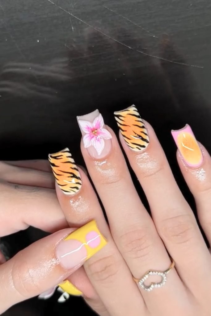 Tropical Tiger Nails blends vibrant colors and bold patterns. Featuring tiger stripes in sunset hues, a delicate pink flower accent, and bright yellow and pink geometric designs, these nails bring a tropical jungle vibe to your fingertips.