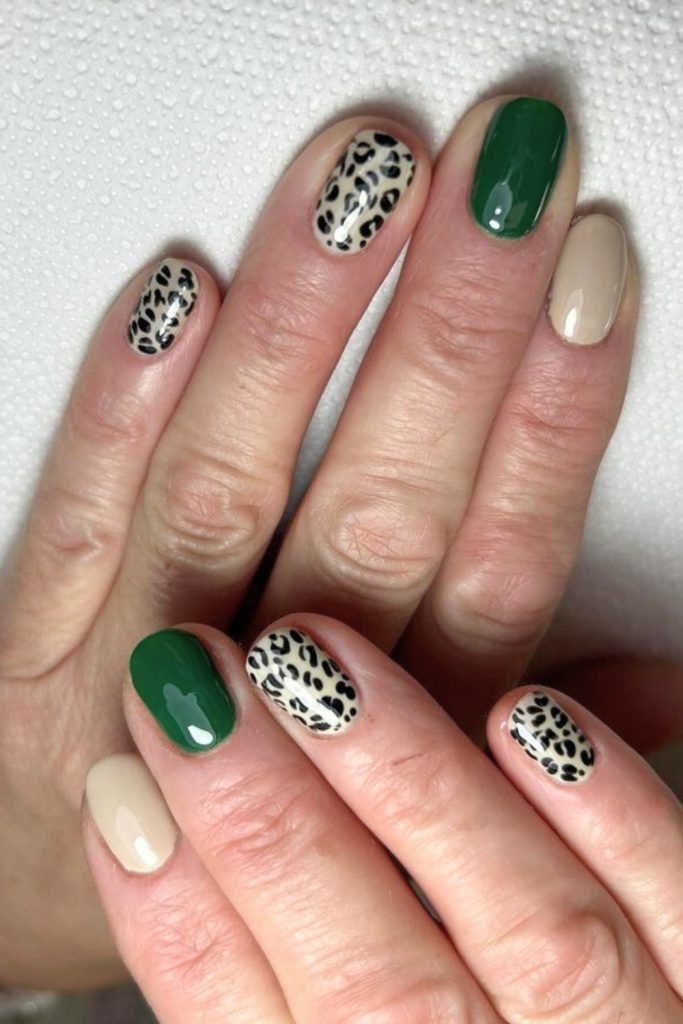 Jungle Chic Nails brings a sophisticated twist to animal prints. Featuring a mix of earthy green, nude, and bold leopard spots, this design exudes elegance and wild charm.