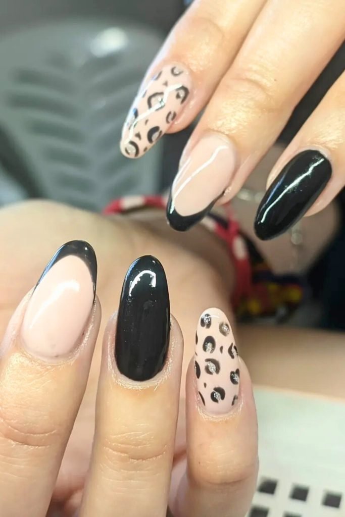 The mix of glossy black and nude with delicate leopard spots adds a touch of elegance, perfect for a refined yet bold statement.