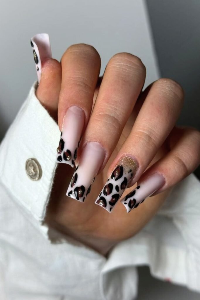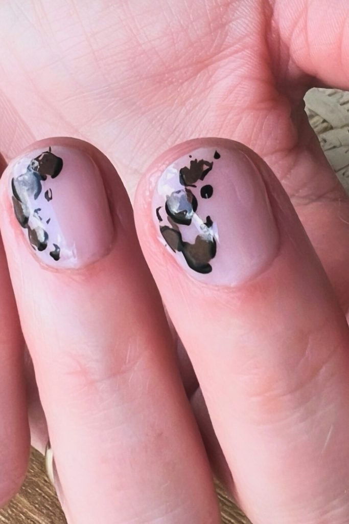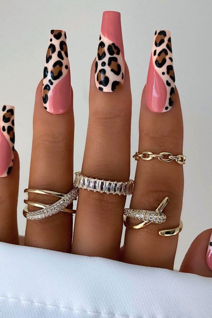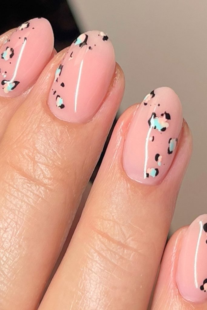 These pastel leopard print nails combine a soft, pink base with delicate, contrasting spots for a chic and playful look.