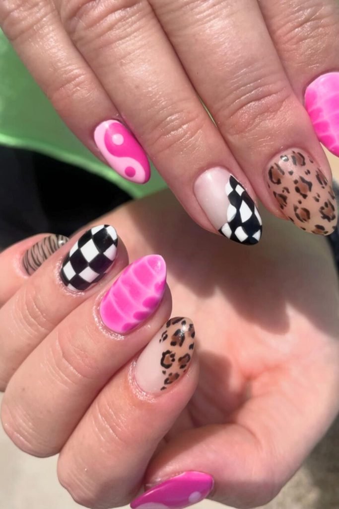 Eclectic Animal Print Medley nails combine various eye-catching designs, including classic leopard spots, vibrant pink swirls, and bold black-and-white checkers.