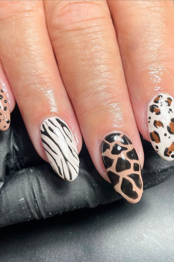 Each nail features a different pattern, from zebra stripes to leopard spots, creating a unique and adventurous look.