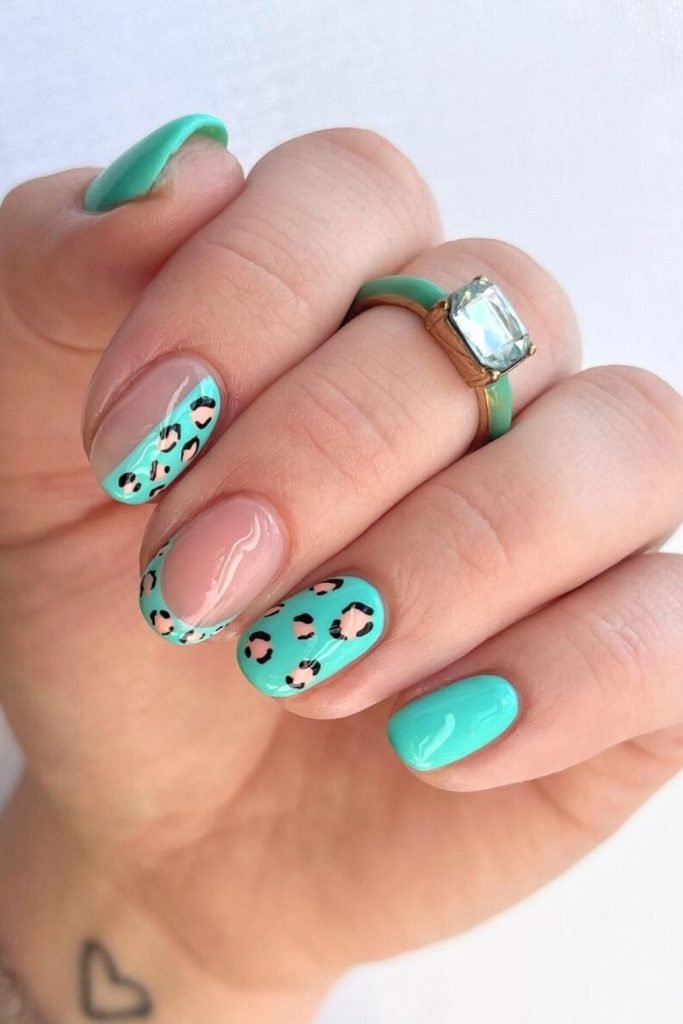 The mix of solid turquoise nails with leopard print accents on a clear base offers a chic look, perfect for summer vibes.