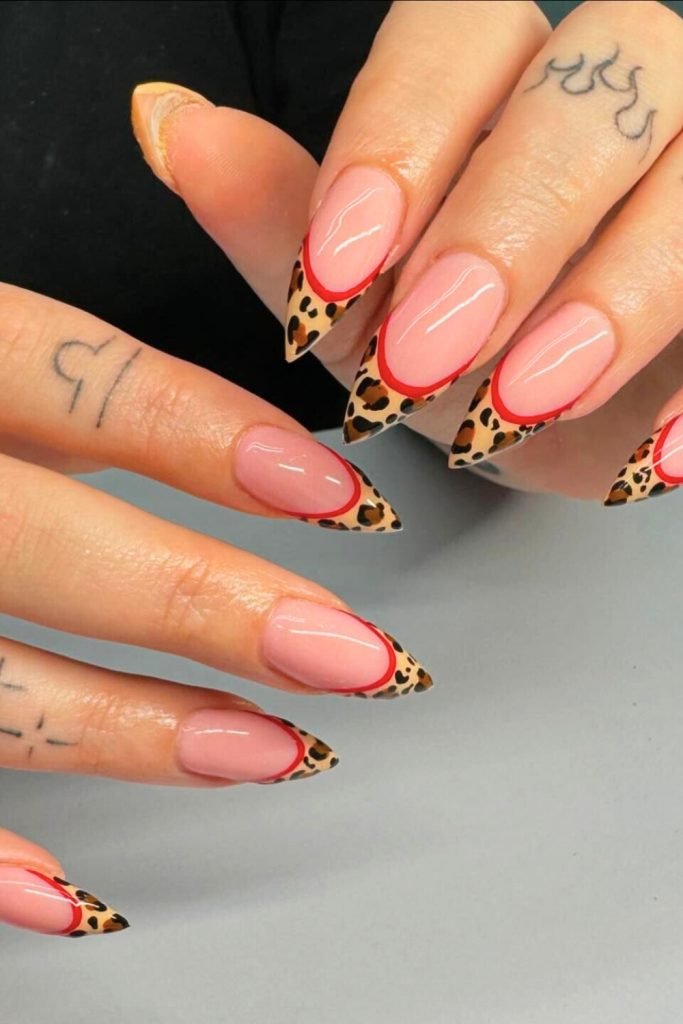 Each nail features a glossy nude base, accented by a striking red outline and fierce leopard print tips.