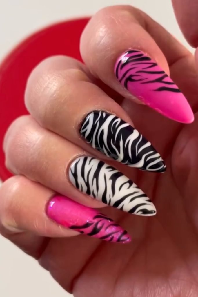 Vibrant Zebra Stripes add a playful twist to the traditional zebra print. Alternating nails feature bold black-and-white stripes and eye-catching pink and black patterns.