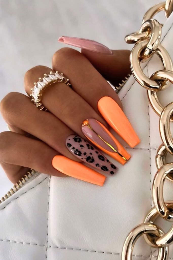 The long coffin-shaped nails feature bold, glossy orange paired with a chic leopard accent nail and delicate gold striping.