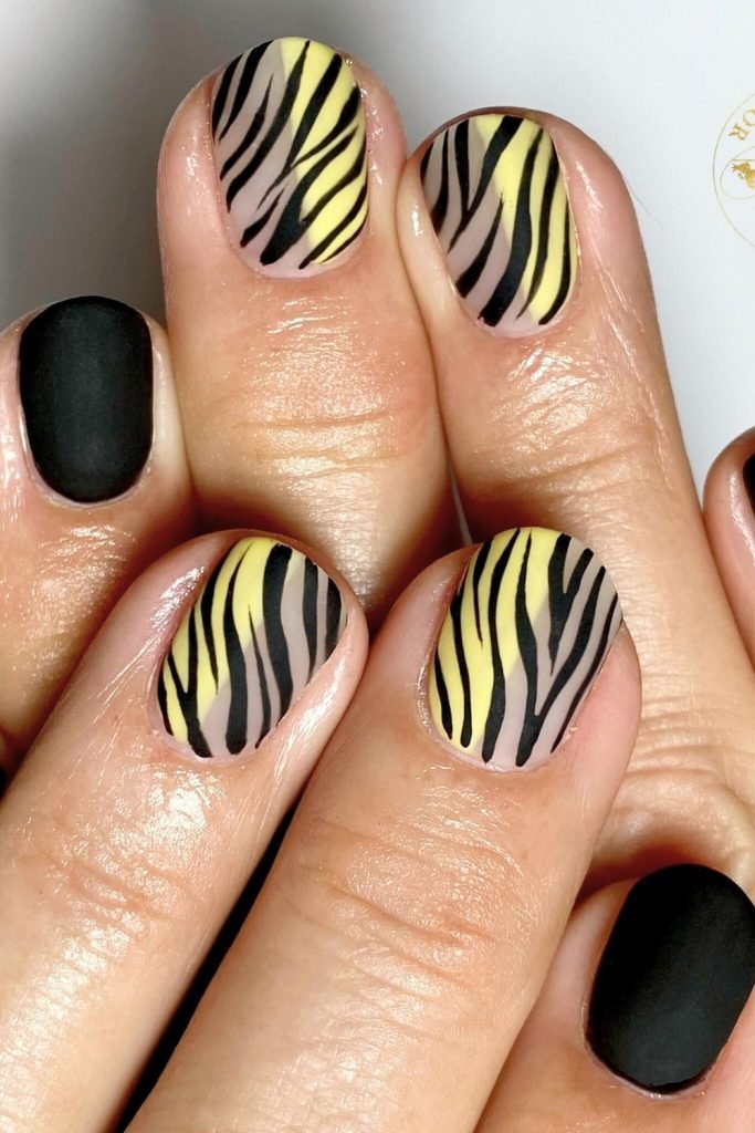 Neon Zebra Fusion nails blend striking black matte with vibrant neon yellow zebra stripes.
