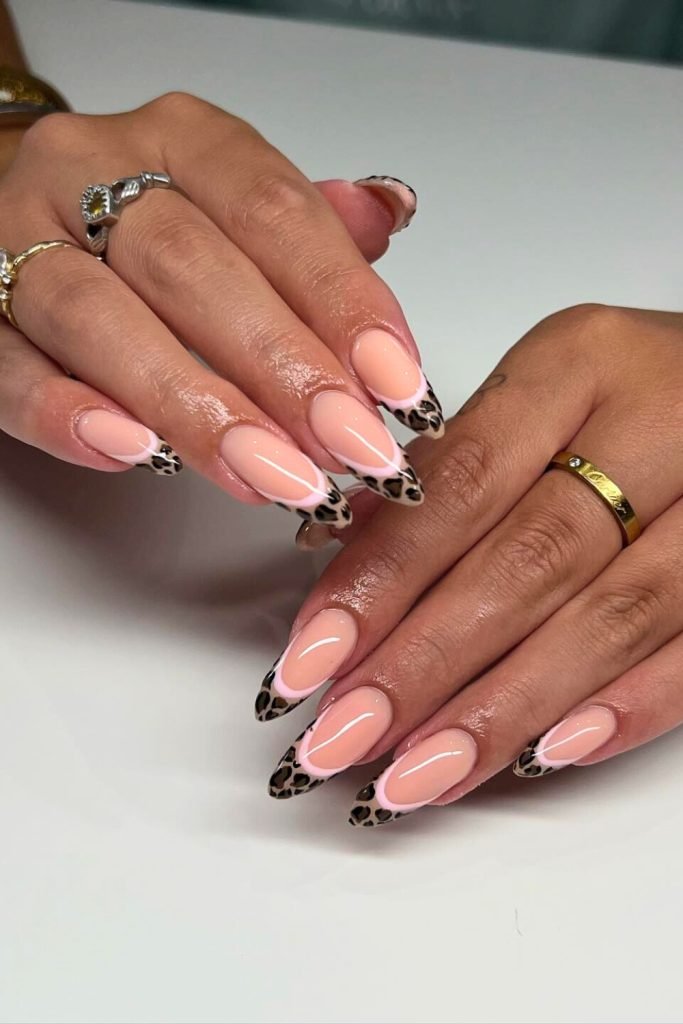 Pink Leopard Tips combines elegant blush pink nails with bold leopard print tips.