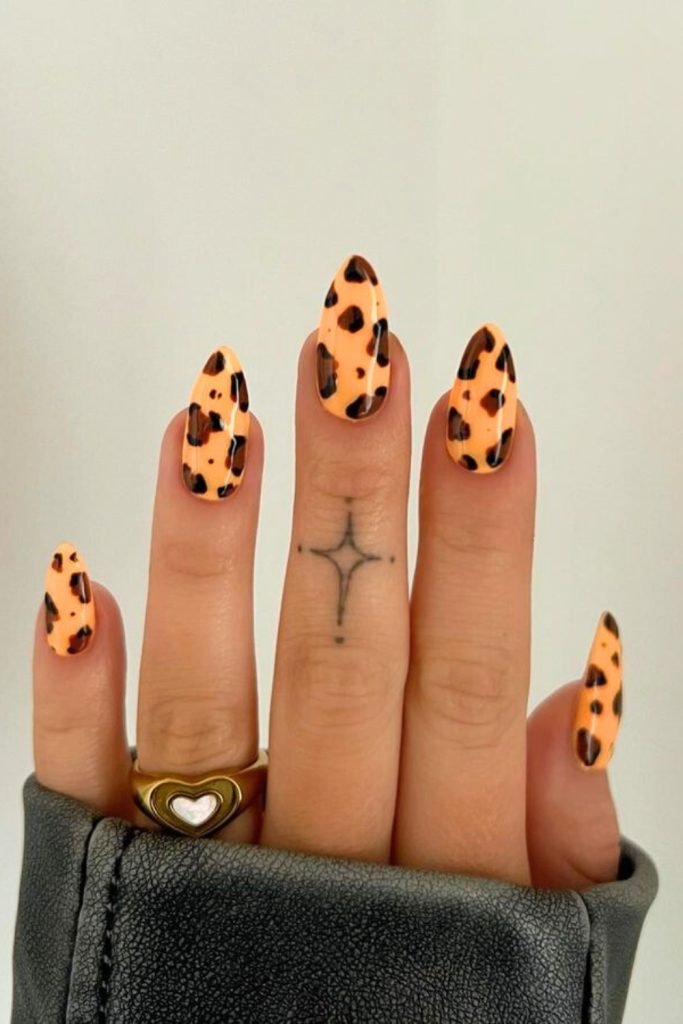 Neon Leopard nails are a bold statement with their striking orange base and classic leopard print.