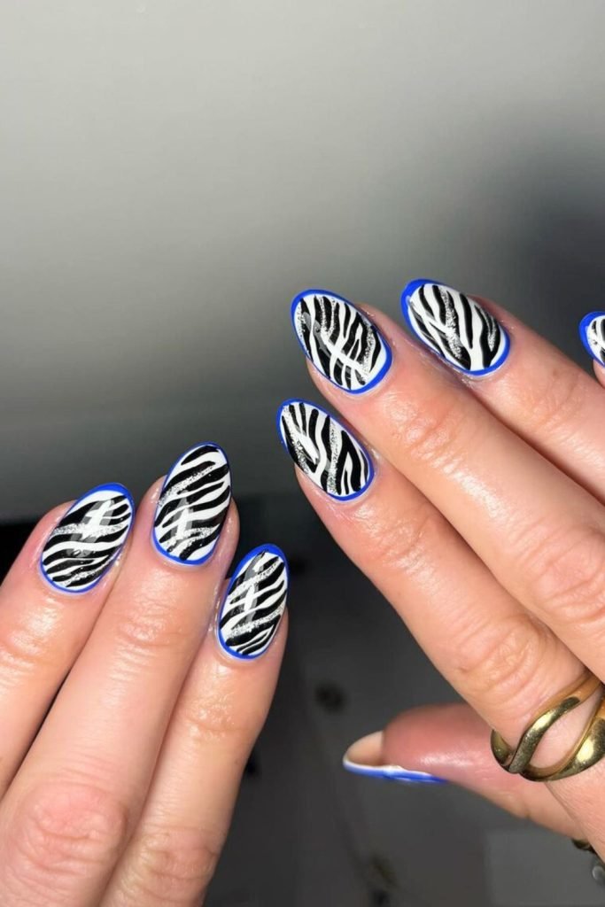 These Electric Zebra Stripes nails feature bold black and white zebra patterns, enhanced with a striking blue outline.