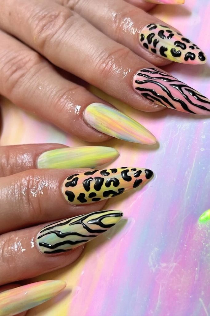 Each nail showcases a different pattern, from leopard spots to zebra stripes, all set against a backdrop of neon pastels.