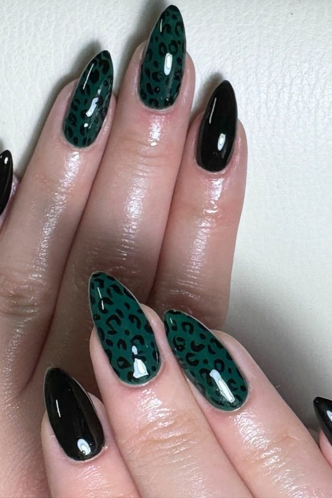 The design showcases glossy black nails paired with emerald green nails adorned with subtle black leopard spots.