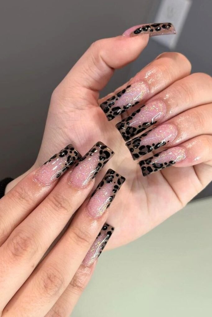 The clear tips with black leopard spots create a striking contrast against the glittery pink base.