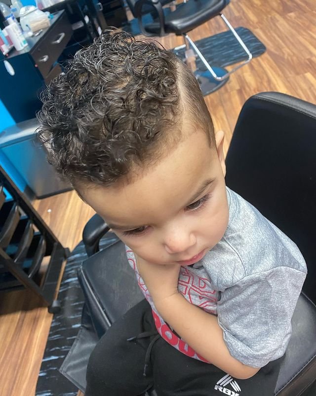 To style this look, apply a light, baby-safe curl cream to enhance the curls’ bounce and definition. This cut is ideal for babies with curly hair, providing a clean, modern look while embracing their natural texture.