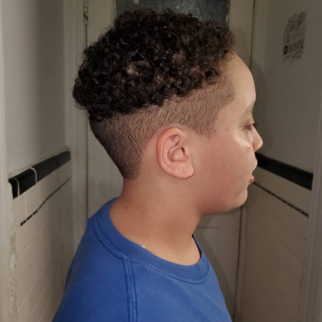 This curly fade combines short sides with the natural texture of curls on top. The sides are trimmed close using clippers, while the top is left fuller to show off the natural curl pattern.