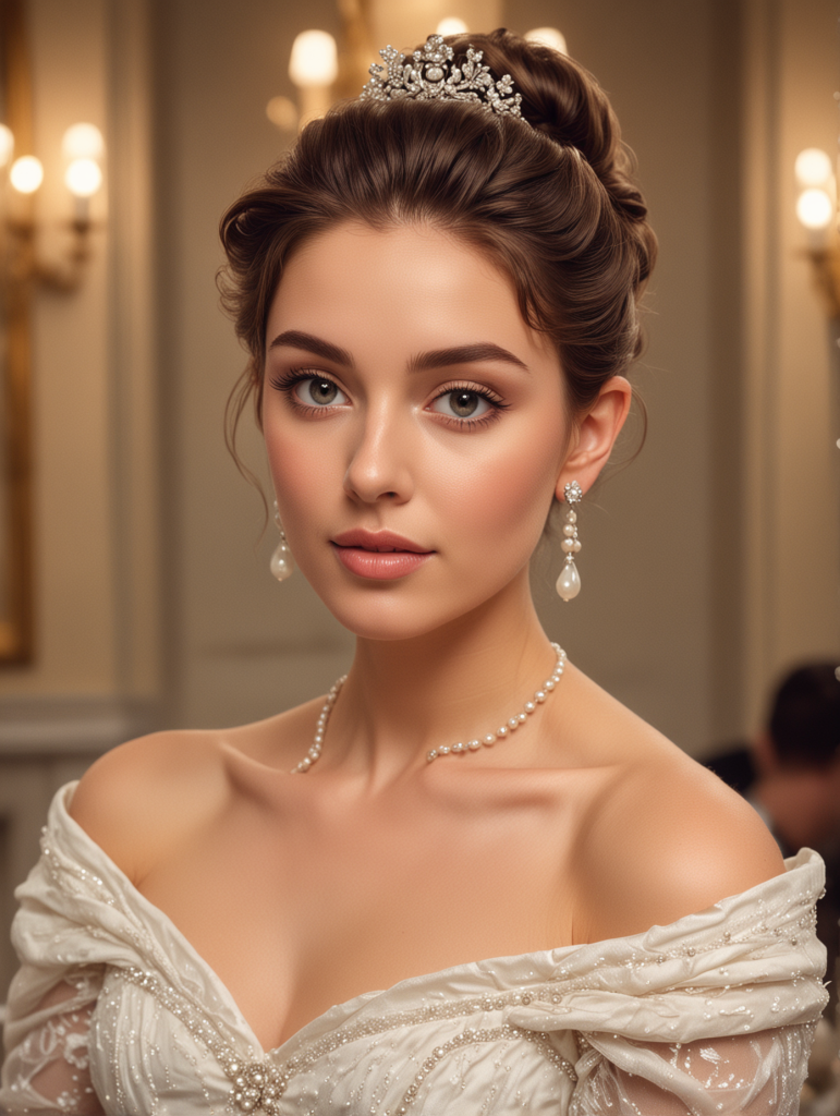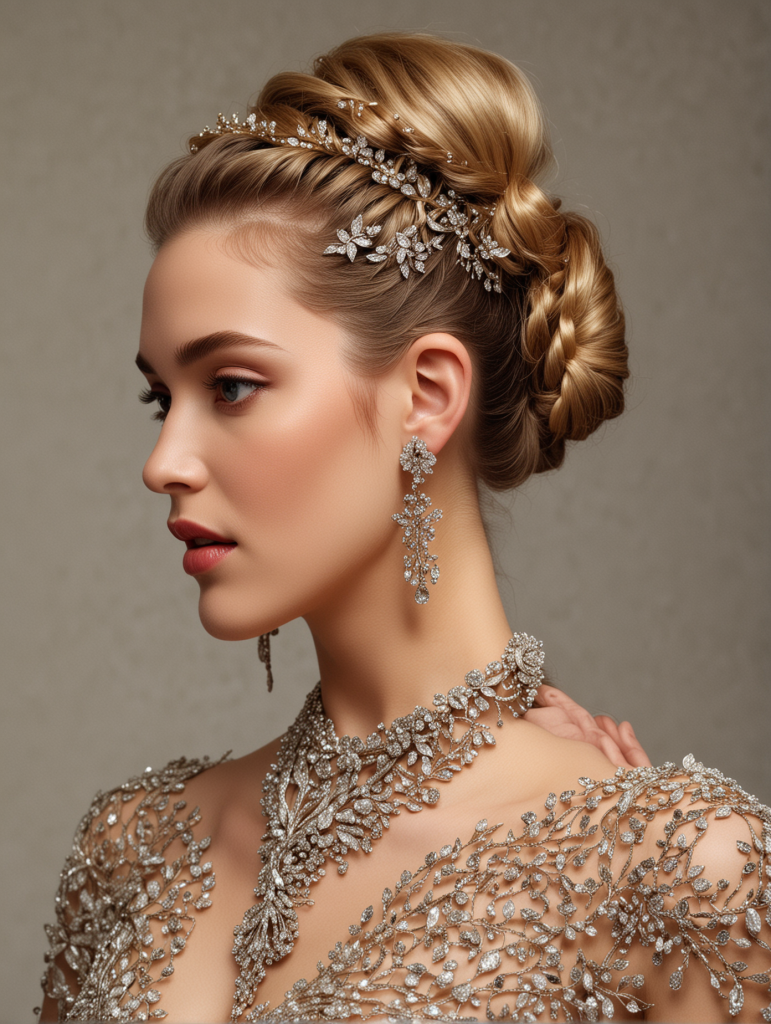 Feel like royalty with a high Regency bun, adorned with a jeweled headpiece.
