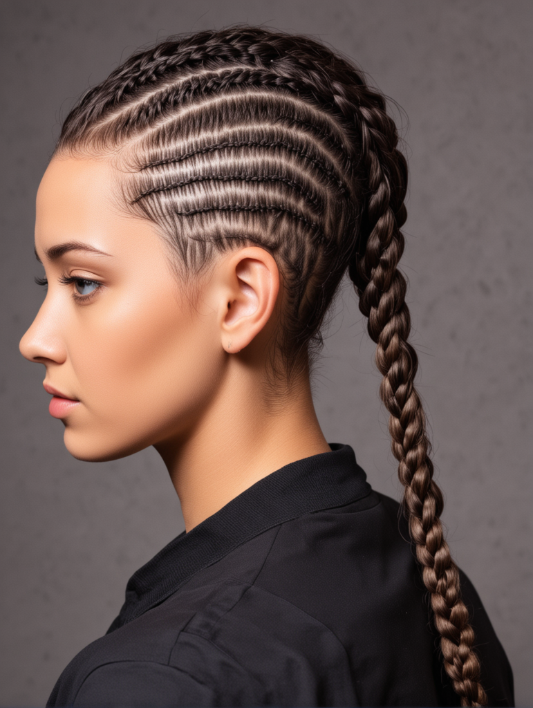 A high ponytail with cornrows is a sleek and sporty style. You can braid your hair from the front to the crown, gathering the ends into a high ponytail.