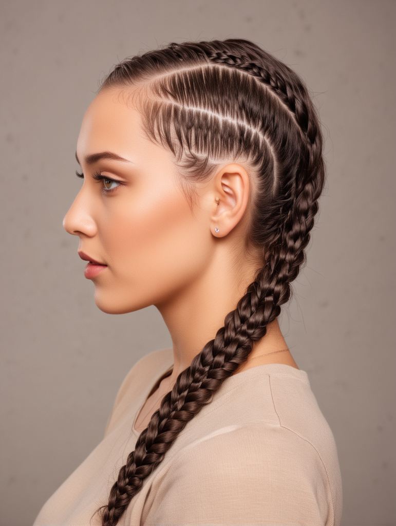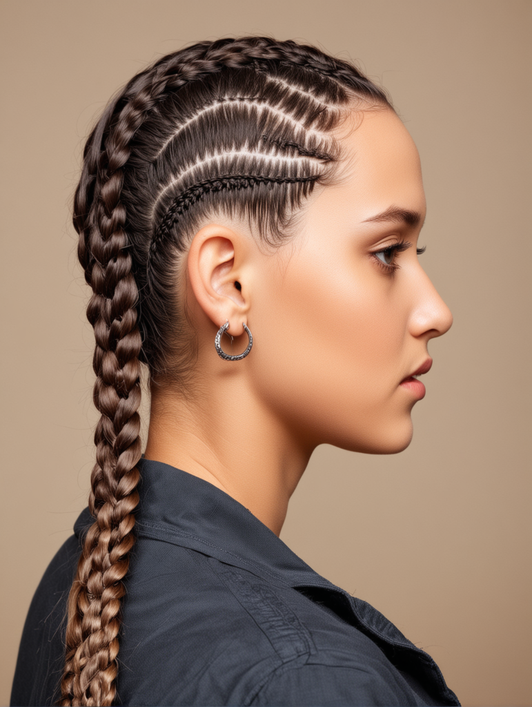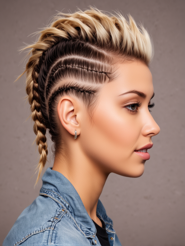 This look is perfect for those who love bold and unconventional styles, offering a striking contrast between the shaved and braided sections.