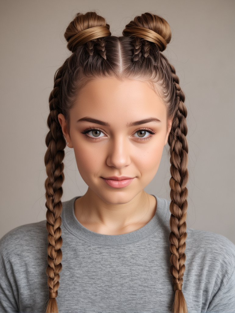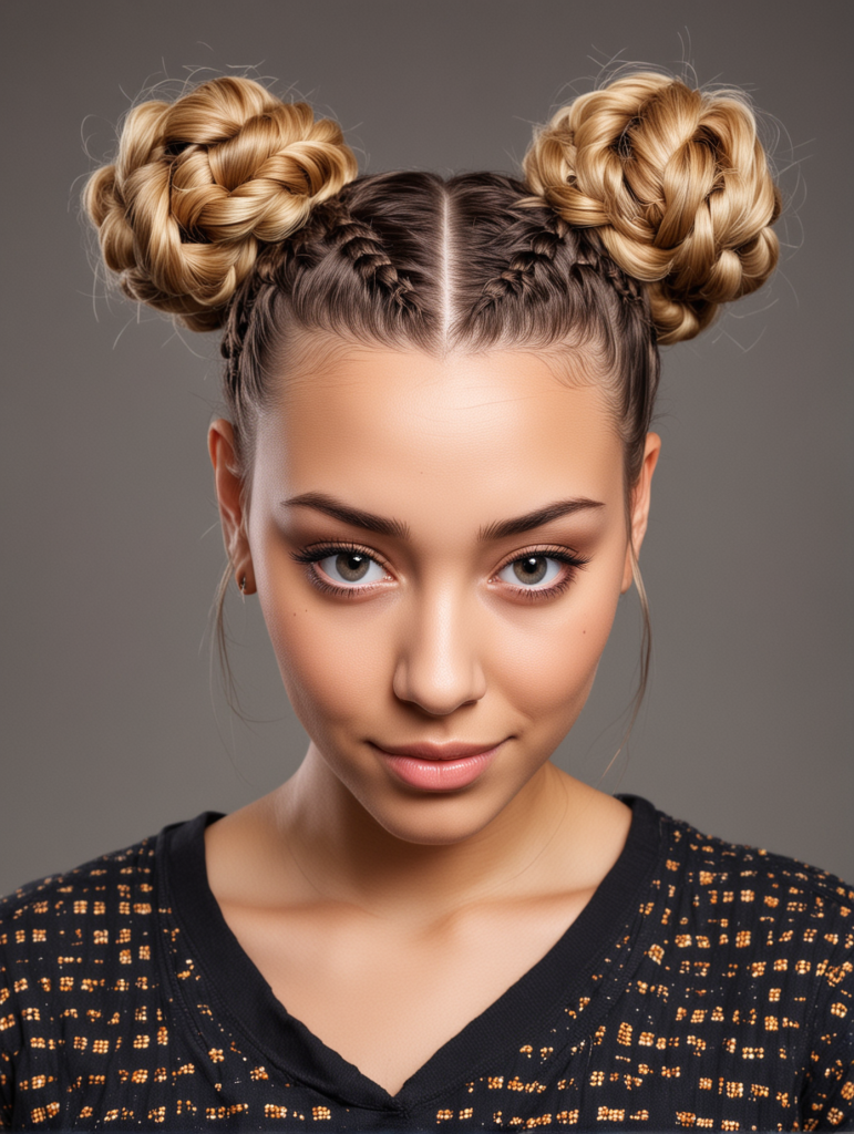 Double cornrow buns are a fun and youthful hairstyle. You can braid your hair into cornrows and then twist them into two high buns on either side of your head.