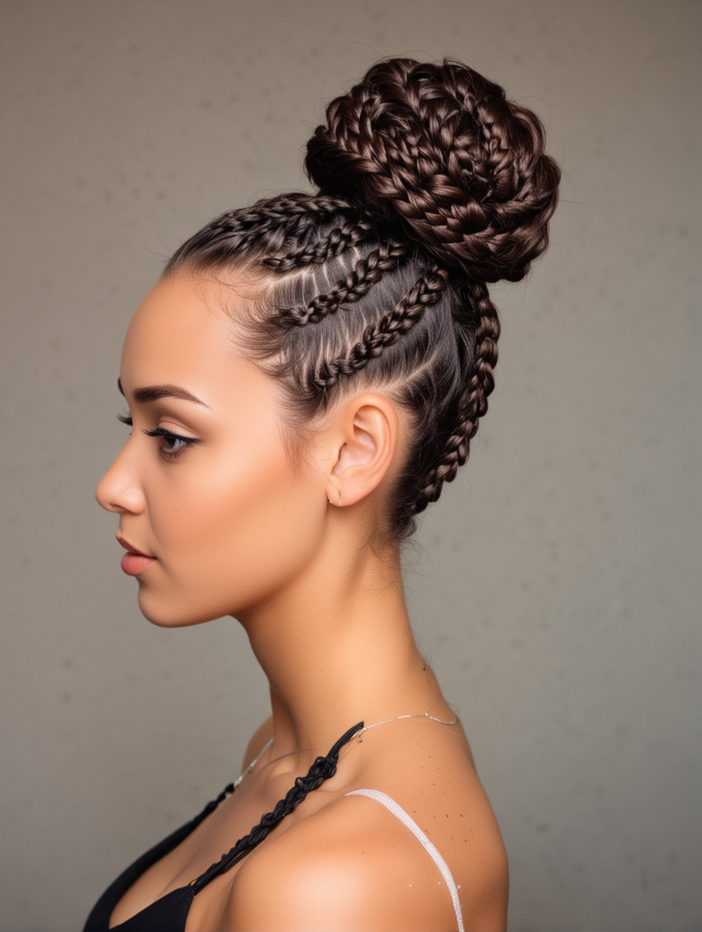 Cornrows styled into a braided bun offer elegance and practicality. You can braid your hair into cornrows from the front to the crown, then gather the ends into a braided bun at the nape of your neck.