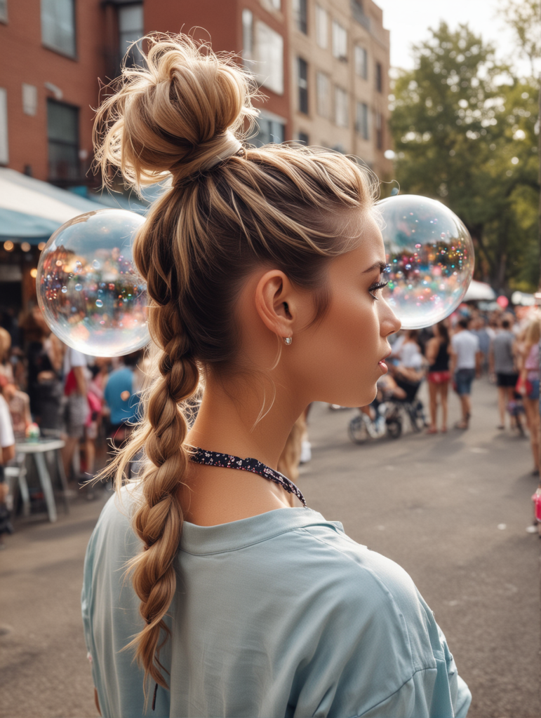 Tie your hair into a ponytail and add more hair ties down the length, puffing out each section to create “bubbles.” This fun and eye-catching style is perfect for trying something different.
