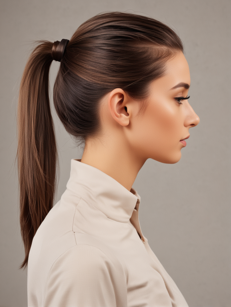 Gather your hair at the nape of your neck and secure it with a hair tie for a low ponytail. This simple, sleek, and versatile hairstyle fits both professional and casual environments effortlessly.