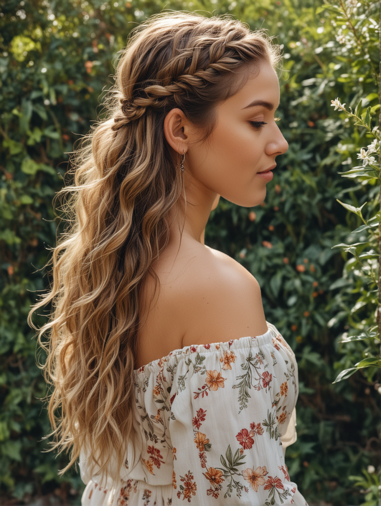 The half-up, half-down hairstyle with braids is both playful and elegant. Begin by creating loose waves throughout your hair.