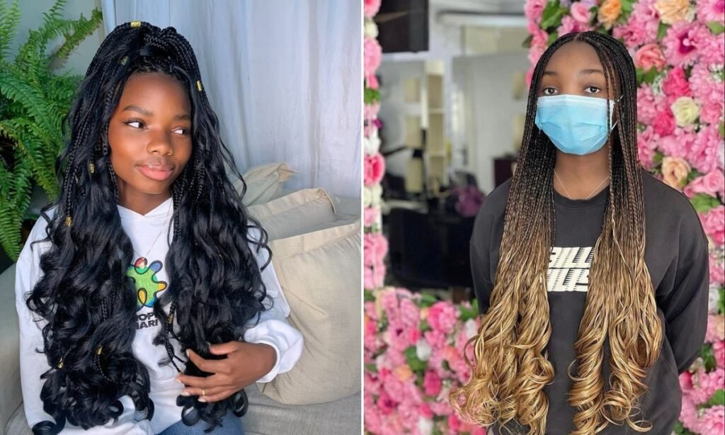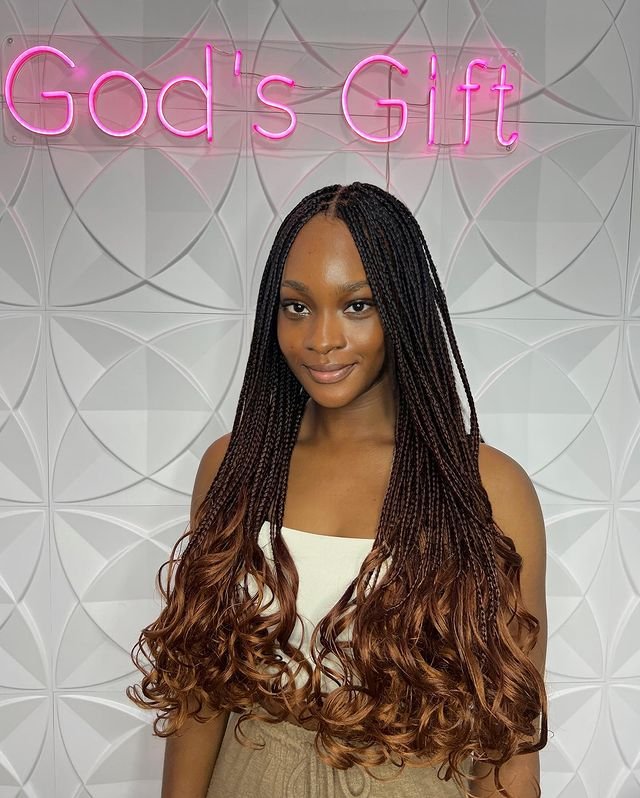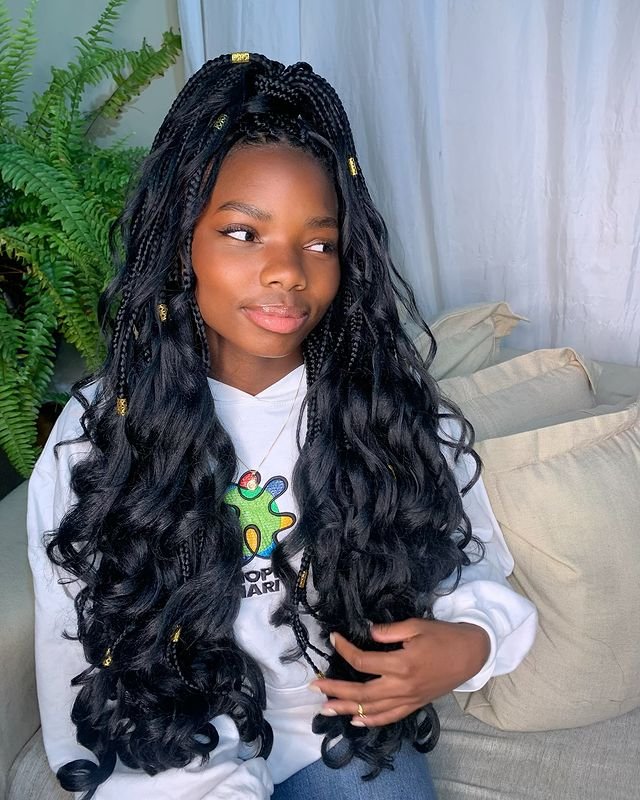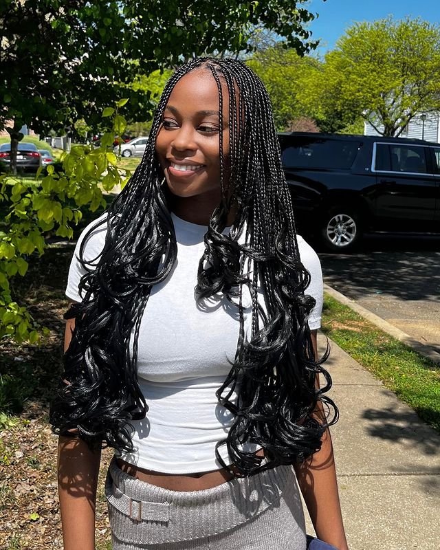 This hairstyle combines classic box braids with loose, flowing French curls at the ends. The braids are neat and tight at the scalp and transition into soft, voluminous curls at the bottom. To recreate this style, braid the hair from the roots to mid-length, leaving the bottom section unbraided.