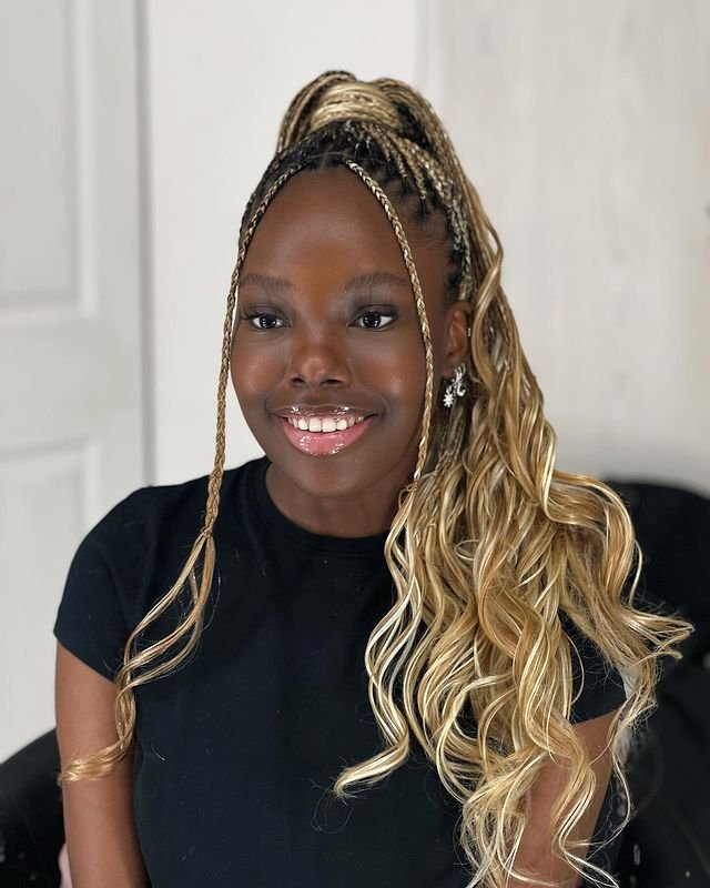 This hairstyle showcases blonde box braids pulled up into a high ponytail, with loose French curls cascading down. The sleek, tight braids add structure, while the loose curls at the end bring softness and movement.