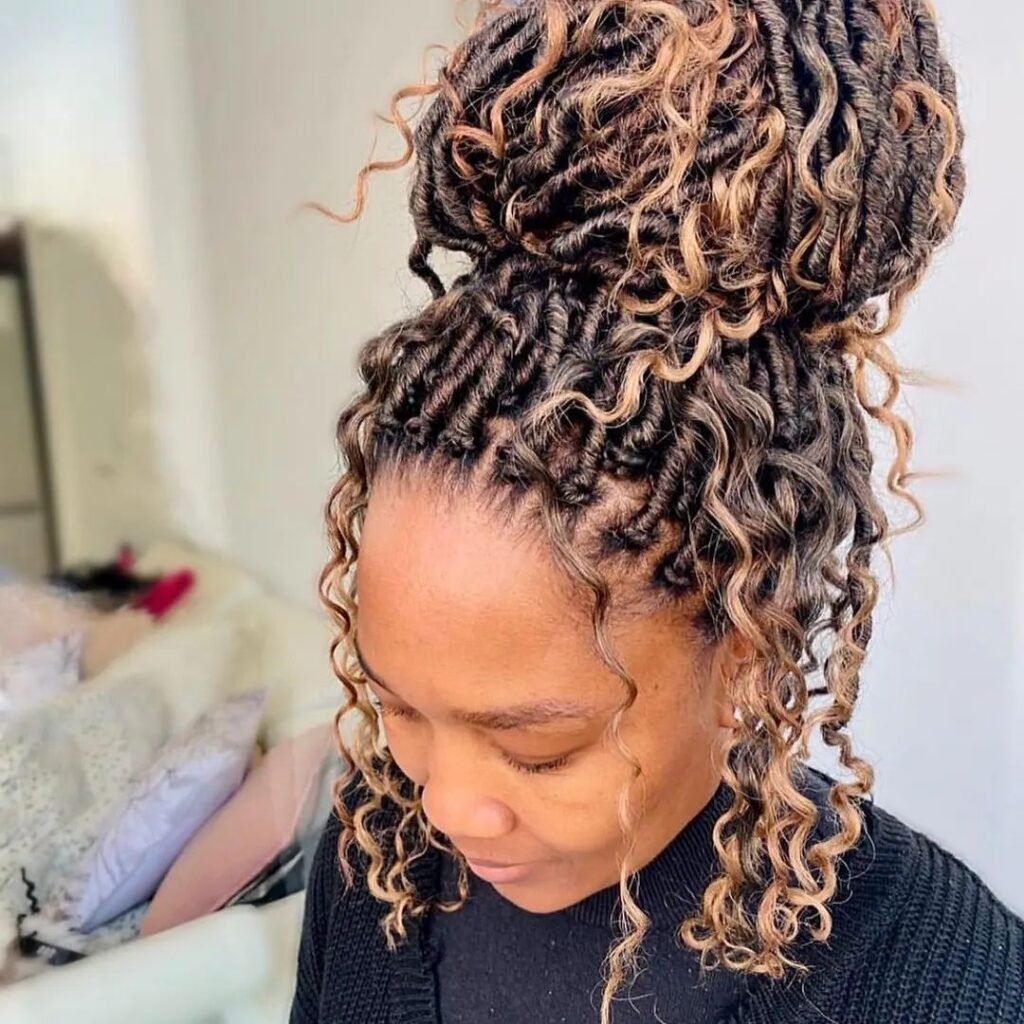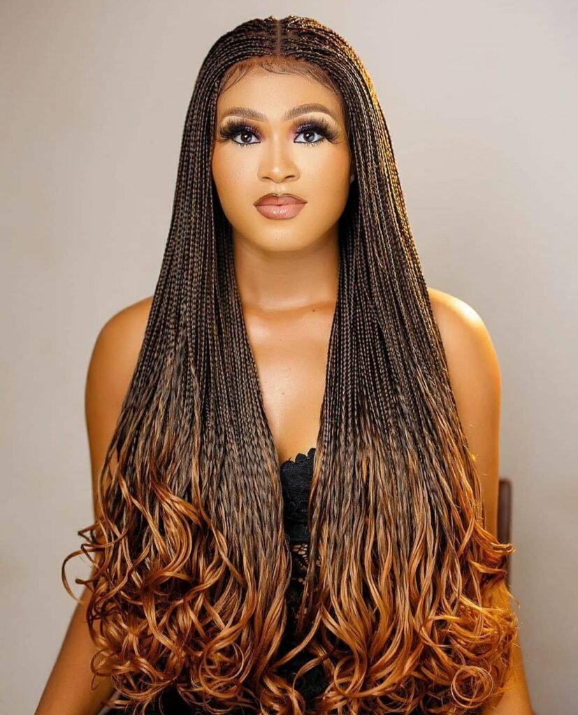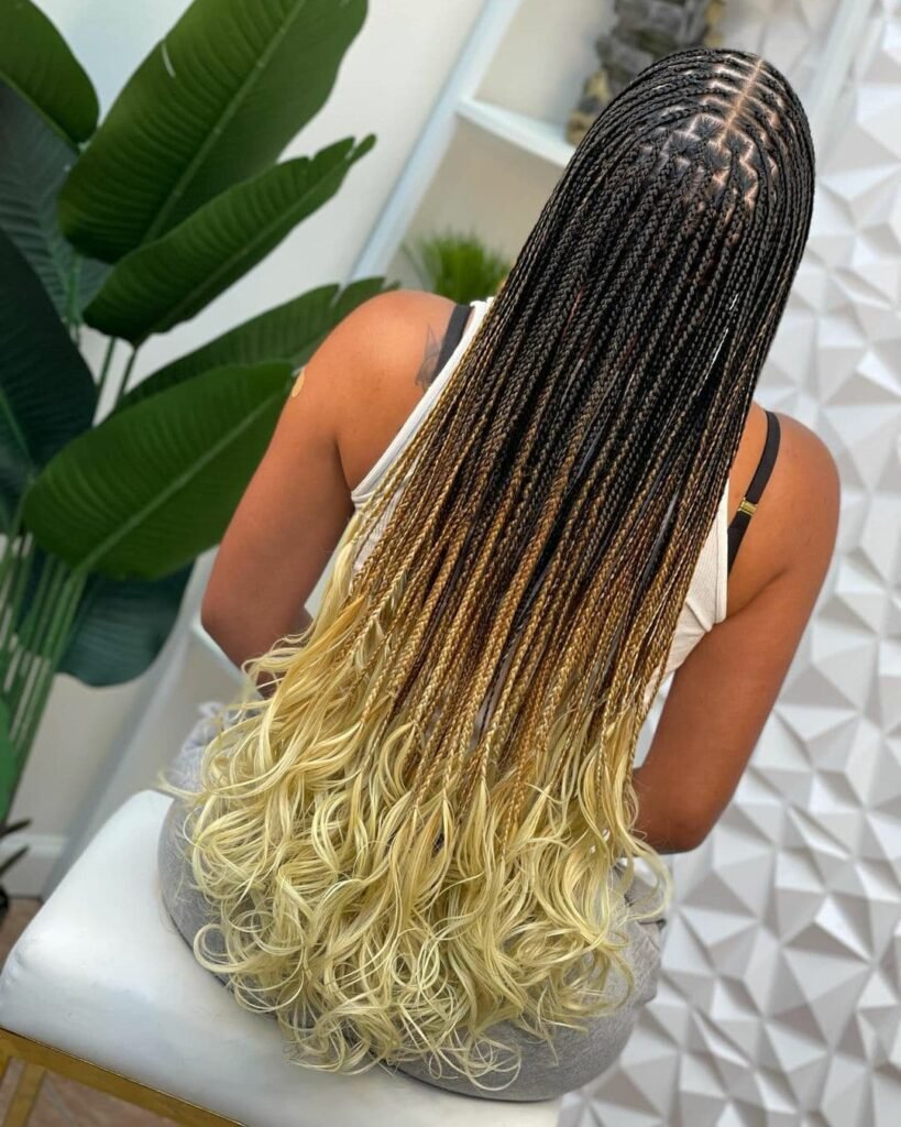 Here, the hair is styled with small, tight braids that flow into light blonde curls at the ends. The combination of dark roots and blonde tips creates a stunning contrast.