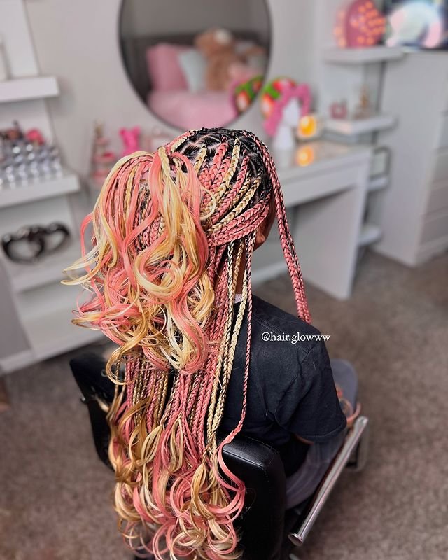 This vibrant and playful style features pink and blonde braids styled into a high ponytail, with cascading French curls. The mix of colors adds a fun, eye-catching element to the look. To achieve this style, first braid the hair in small sections and gather it into a high ponytail.