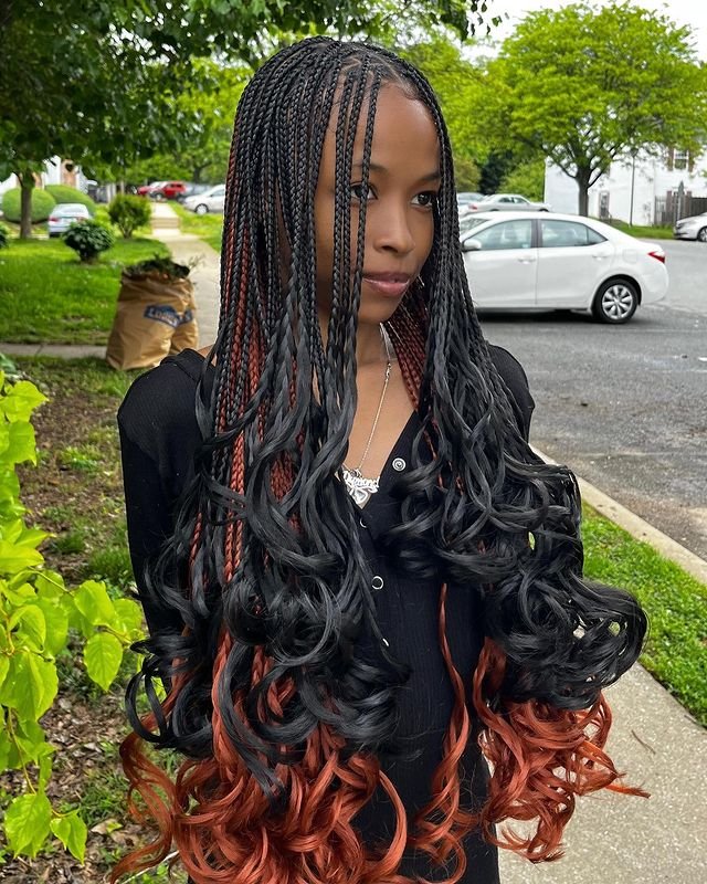 This stunning style combines black box braids with fiery red ombre French curls at the ends. The sleek, tight braids gradually transform into loose, voluminous curls, offering a bold contrast between the braided sections and the wavy ends.